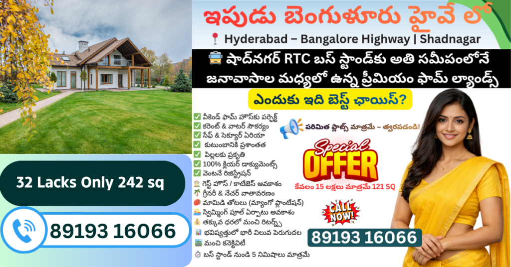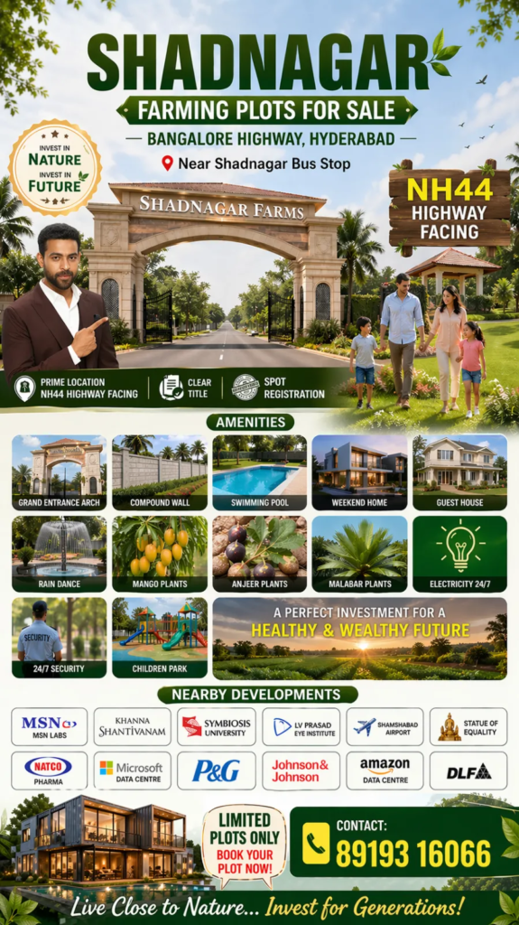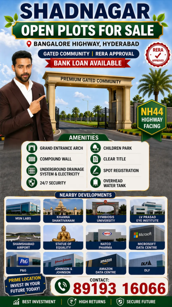 I was searching for HMDA approved plots near Hyderabad, and this project near Shadnagar is perfect. Just 4 KM from town and very peaceful location. I strongly feel this will give me double returns in a few years. β Ramesh K., Hyderabad
