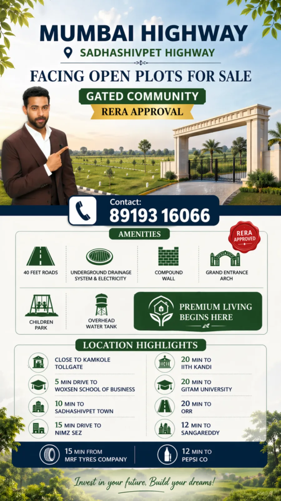 First-Time Investor I invested in DTCP approved plots near Sadashivpet on Mumbai Highway. The location is growing fast due to industries. I feel this is one of my best investment decisions.β Priya M., Bangalore